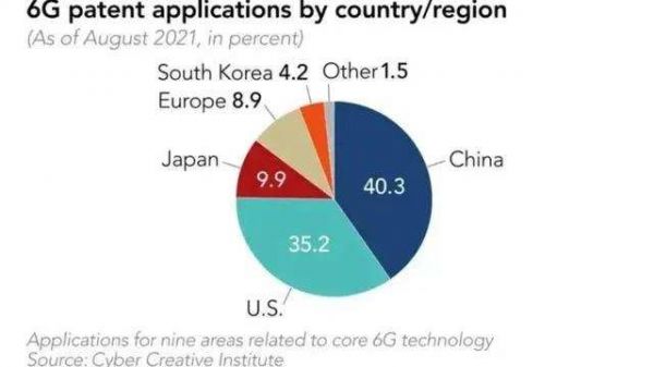 该报道显示,面向全新的6G通信,国际上3个国家已经在专利领域上展开了激烈的竞争。其中在6G核心技术专利的申请数量上,中国占比在40%左右,处于领先于全球的地位,美国在35%左右,而日本接近10%。同时,该媒体也提到了一个事实:在6G的时代中掌握越多的相关专利,在话语权上的优势也就更高。