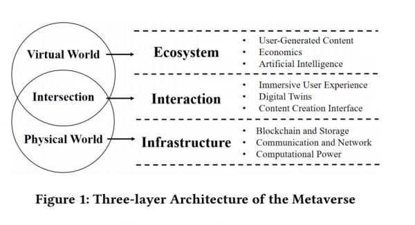 在蔡玮教授的论文《 Metaverse for Social Good: A University Campus Prototype 》中,他从宏观角度提出一个三层的元宇宙架构,包括基础设施、交互和生态系统,并总结出元宇宙的七个特征,分别是:区块链、VR/AR、数字孪生、用户内容生成器、UGC、经济学和人工智能。(感兴趣的读者可以点击链接下载阅读https://arxiv.org/pdf/2108.08985.pdf)