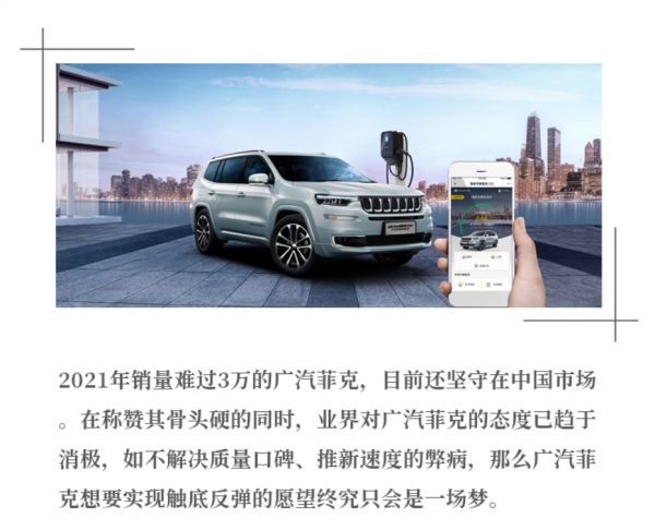 回顾长安铃木、一汽马自达等黯然出局的合资品牌,5万的年销量似乎成为了车企考虑退市与否的检测线,2021年销量难过3万的广汽菲克,目前还坚守在中国市场。在称赞其骨头硬的同时,业界对广汽菲克的态度已趋于消极,如不解决质量口碑、推新速度的弊病,那么广汽菲克想要实现触底反弹的愿望终究只会是一场梦。