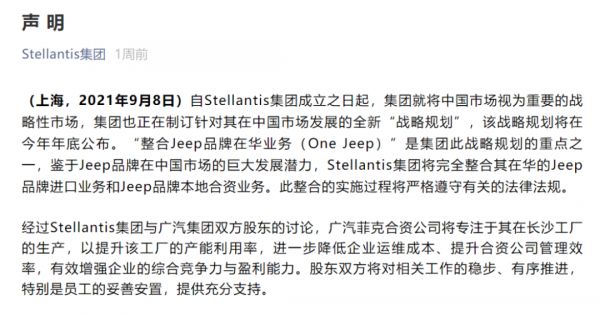9月8日,Stellantis集团发布声明:“经过Stellantis集团与广汽集团双方股东的讨论,广汽菲克合资公司将专注于其在长沙工厂的生产,以提升该工厂的产能利用率,进一步降低企业运维成本、提升合资公司管理效率,有效增强企业的综合竞争力与盈利能力。”