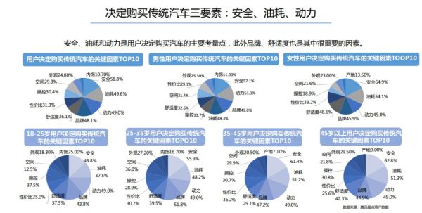 腾讯看点的《用户价值报告——汽车篇》显示,不同消费场景下不同人群维度的选择差别各有侧重,这意味着消费者细分化更加严重,消费需求愈加多元,安全、油耗、性价比、舒适度都成为了用户购车时重要的参考点。