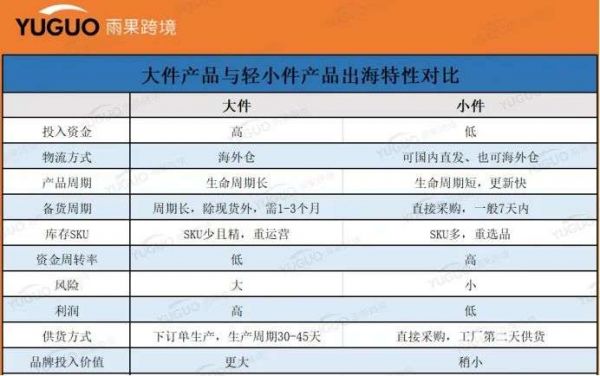 雨果跨境试图从投入、物流、资金、库存等几个维度来分析下大件产品与轻小件产品出海的区别: