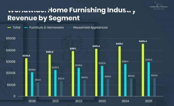 上述提到资金、物流、售后、体验、渠道等,家居家具出海虽痛却也甘之如饴。以家具为例,根据Mangento数据统计,目前,全球家具和电器线上销售收入为3629亿美元。在接下来的五年里,预计将达到4554亿美元,增长25%。其中,2020年北美家居电商的市场份额增加了20%,由于住房市场需求增加、逐渐完善的航运基础设施等影响,美国市场预计到2023年将跃升至23%。