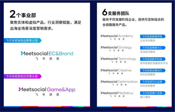飞书深诺是一家出海数字营销公司,近日,飞书深诺将原先旗下四大场景全链路出海服务(APP、电商、品牌、游戏)升级为全新2+6事业部,业务聚焦电商品牌和游戏应用两大板块。