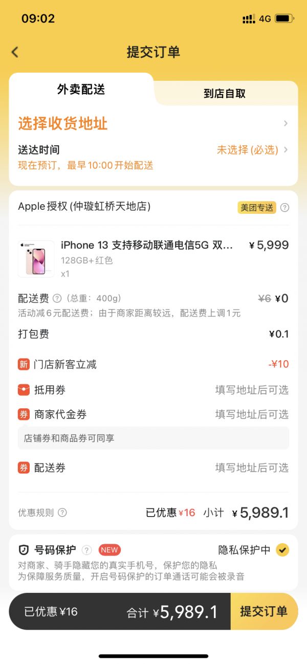 今天,连美团外卖都推出了iPhone 13现货一小时达服务。美团外卖全国117个城市498家Apple授权专营店,限量开售iPhone13现货。9月24日早上9点,记者打开美团外卖,开屏显示“iPhone 13 一小时送达服务”的广告,但页面主要出售iPhone 13和iPhone 13 mini两款。选择机型之后,美团外卖会根据用户的位置显示附近的门店。店铺显示,现在预定,10点起送,预计送达时间最早为11:20。