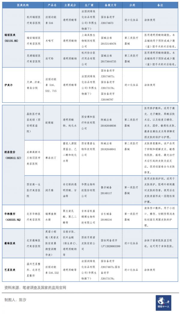 下表是笔者在调查中发现的,医美机构在水光补水项目中超范围注射的产品。