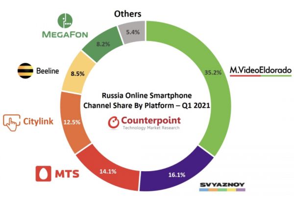俄罗斯电信运营商在网售智能手机渠道份额/来源:Counterpoint