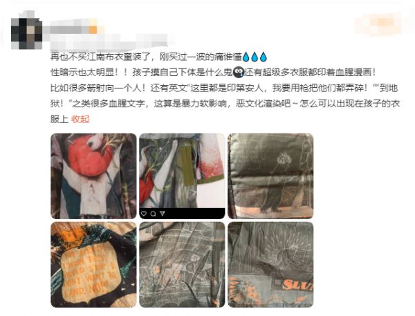 雷达财经注意到,在此次童装翻车事件发生后,陆续有网友指出江南布衣旗下的童装还存在暗黑、暴力、血腥、色情等元素。