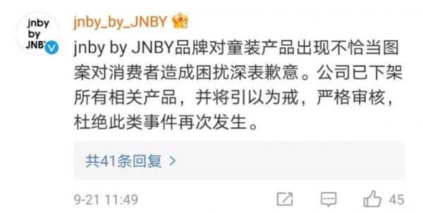 9月21日,“jnby by JNBY”在微博评论区回复网友的评论就此次风波进行致歉。