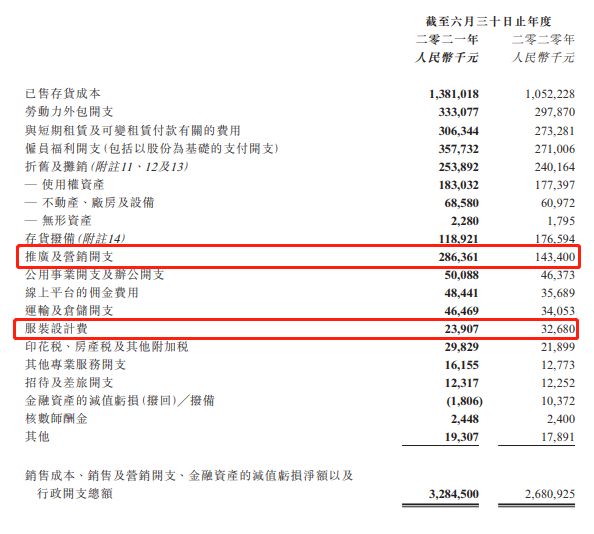 雷达财经注意到,2021财年江南布衣用于服装设计方面的费用为2391万元,上一财年为3268万元,同比减少877万元。与此同时,推广及营销方面的支出却有所增加,2021财年为2.86亿元,2020财年为1.43亿元,翻了一倍。