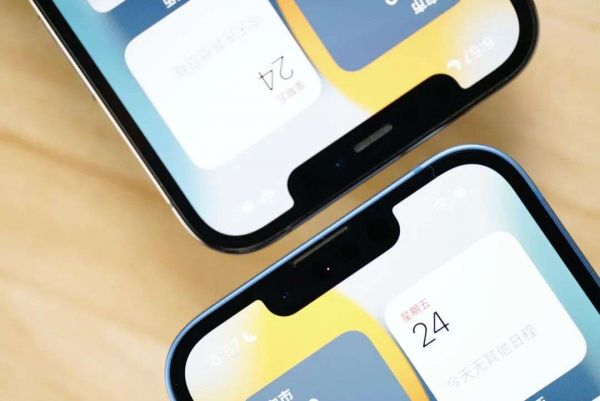 在整机外观上,iPhone 13主要的变化点是屏幕刘海的大小和后置镜头模组的位置。先看刘海,发布会上说iPhone 13系列的刘海相比上一代尺寸小了20%,光听数字可能觉得没什么,拿到手机后小雷才发现,尺寸小了20%的刘海还是挺明显的,特别是对比了iPhone 12发现,刘海右边显示连接和电池的区域宽敞了不少,不过目前依然无法显示电量百分比信息。