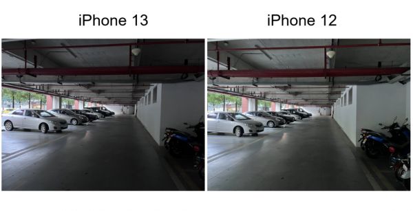 第二组是一楼停车场的场景,两组样张的亮度都要高于人眼现场可见的亮度,其中iPhone 12样张的亮度要高于iPhone 13,只不过还是存在偏绿的问题,摩托车旁的白墙和天花板微微泛绿,而iPhone 13的样张整体氛围感更强,没有过于强调画面亮度。