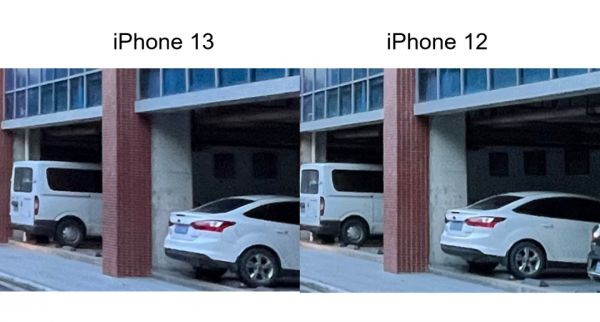 最后是夜间成像表现,两者的表现很相似,iPhone 12在夜间依旧存在泛绿问题。iPhone 13的优势是色彩还原更准,样张边缘的噪点也要更少一些,但这要放大图片仔细抠细节才能察觉得到(特指噪点)。