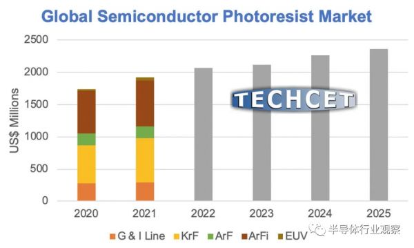 作为芯片生产不可或缺的一种原材料,与5000亿美元的半导体市场相比,光刻胶的市场规模并不大。据TECHCET发布最新统计和预测数据:2021年,半导体制造所需的光刻胶市场规模将同比增长11%,达到19亿美元。