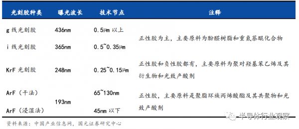 在半导体领域,则主要分为5个种类,分别是g线光刻胶,i线光刻胶,KrF光刻胶,ArF光刻胶和EUV光刻胶。