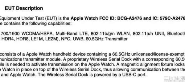 让我们先忘记外界猜测的那些内容,把注意力集中到认证信息的描述上。不难发现,Apple Watch Series 7的这个隐藏式无线通讯模块,主要功能特征其实基本可以被归纳为两条,一是工作在60.5GHz的超高频段下,二是疑似有效传输距离极短,必须先用磁力底座确保设备贴合且正确对准。