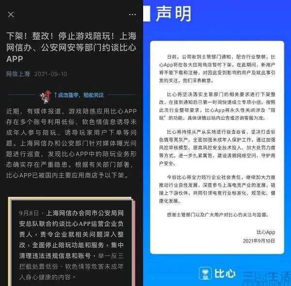 早在这一轮游戏陪玩APP被下架前,在8月下旬新华社发布的题为“揭秘陪玩行业内的涉黄交易”视频中就曾提及,“根据媒体报道,游戏陪练应用比心App存在多个账号利用低俗、软色情信息诱导未成年人参与陪玩、诱导玩家用户下单等问题”。此外,人民网也几乎是在同一时间发布了相关报道。