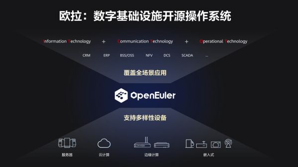 据介绍,欧拉操作系统同时支持服务器、云计算、边缘计算、嵌入式等各种形态设备的需求。应用场景覆盖IT(Information Technology)、CT(Communication Technology)和OT(Operational Technology),实现统一操作系统支持多设备,应用一次开发覆盖全场景。