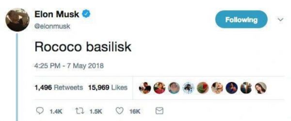 2018年4月,马斯克在推特上发了两个词,“Rococo basilisk(洛可可的蛇怪)”,玩了一把谐音梗,其原词应该是“Roko’s Basilisk(罗科的蛇怪)”,后者是一个关于AI的荒谬论点。