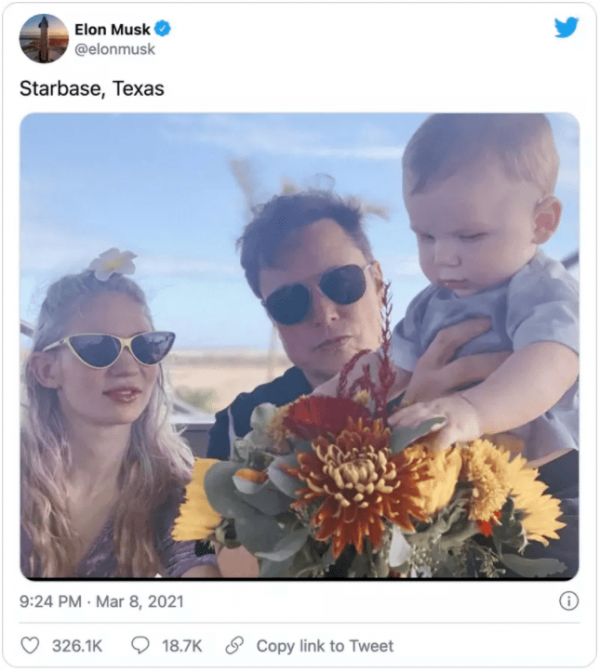 时间快进到2020年1月,Grimes忽然在社交平台上晒照,宣布怀孕了,4个月后,他们的孩子降生了。这孩子一出生,还不知道互联网是何物,就凭借奇奇怪怪的名字上了一次热搜。