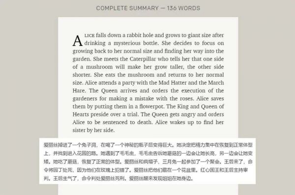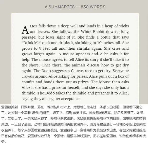 以很多人看过的《爱丽丝梦游仙境》为例,这本书共十二个章节,近26,449词。在AI更改后变成以下136词英文摘要,也就是差不多一条微博文字的长度,大家感受一下: