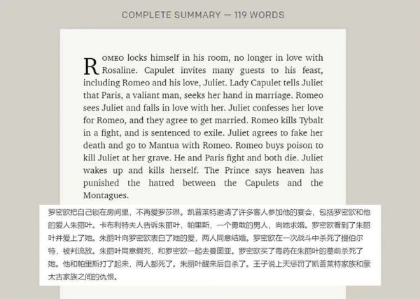 看完童话故事,再看看更有难度的著名剧作家莎士比亚的名著《罗密欧与朱丽叶》,“读”完这本书后,AI写下119词摘要: