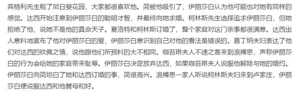 这一小说主要讲述了乡绅之女伊丽莎白·贝内特和富有的达西先生,以及他们的亲友简和宾格利的爱情故事,反映了19世纪英国乡绅阶层的礼节、成长、教育、道德、婚姻的情态。可以看到机器还是抓住了几个主角的爱情故事的主旋律,逻辑基本没有问题。不过不足之处和前面也十分类似,机械化、堆砌、缺乏多层次抽象。