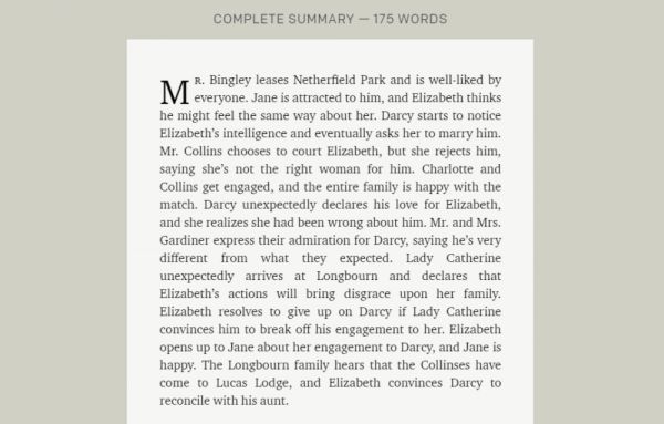 看完AI对短篇文学作品的梗概,我们再来看看中长篇,比如简·奥斯汀12万词的《傲慢与偏见》,摘要是这样的: