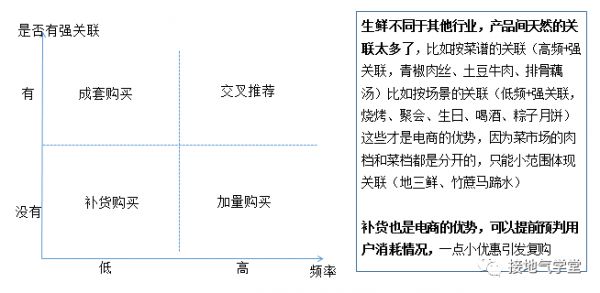 有一个简单的矩阵模型可以描述生鲜产品的复购思路,核心是产品购买频率和产品关联度。购买频率上文有解释,产品关联度指的是某些产品天生会一块买。特别在生鲜领域,比如买了冻鸡翅、竹签,很有可能会买木炭、丸子、烧烤汁,因此两维度交叉既有如下矩阵(如下图)。