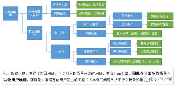 有了三个维度的基础理解,就能用来综合解释问题。回到开头的“生鲜电商复购率低”的问题。可以先从人货场角度建立分析假设: