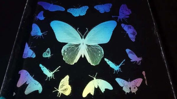 2015 年,密苏里科技大学的研究人员也是根据结构色原理,创造了一种「无墨打印机」。他们使用激光在金属材料上打出数千个小孔,以产生和蝴蝶翅膀相同效果的微观结构,但只有金、绿、橙、青、洋红和海军蓝等少量颜色能被显现出来。