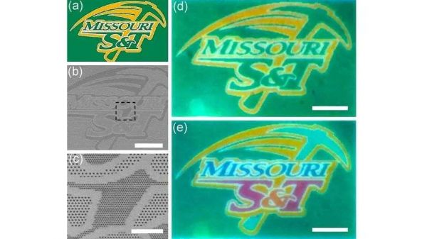 更重要的问题是,「无墨打印机」只能在微观层面上工作,它使用了一种薄夹层材料——只有 170 纳米厚,由两层银组成,中间是一层二氧化硅。这个全彩版的密苏里科技大学标志,它的尺寸大约为十亿分之一米。