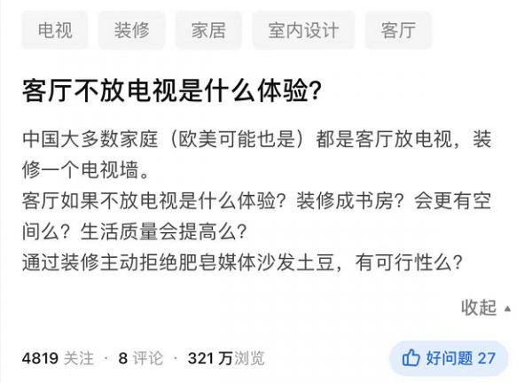 打开年轻人聚集的知乎、小红书等问答、种草平台,家装类客厅布置相关的内容里,越来越多的案例都在弱化电视机这个大屏幕的地位,被个性张扬的Z世代丰富多元的喜好需求所取代,如手办展示柜、手工制作台、家庭办公区等等。