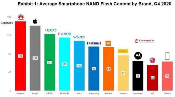 市场研究机构 Counterpoint Research 数据显示,2020 年全球智能手机平均 NAND 容量已经超过 100GB,中高端智能手机的最低存储容量标准正逐渐转向 128GB。