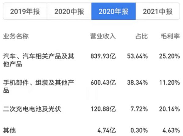 从收入构成上看,比亚迪主营收入共分为汽车业务、手机部件及组装业务、二次充电电池及光伏业务三部分。2020年,比亚迪汽车、汽车相关产品及其他产品业务的收入约839.93亿元,收入占比约为54%。公司手机部件业务、二次充电电池及光伏业务合计占比约为46%。