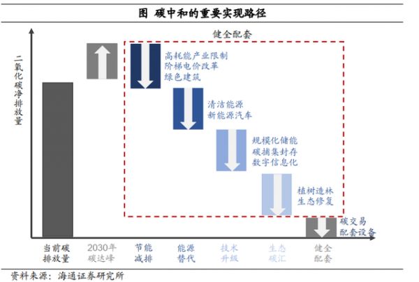 这些“猛”举措的背后,遵循一套逻辑。根据海通证券的数据,碳中和实现路径中,节能减排、能源替代、技术升级、生态碳汇等方面都有着具体的措施,其中“高耗能产业限制”是减少二氧化碳净排放量影响最显著的措施之一。