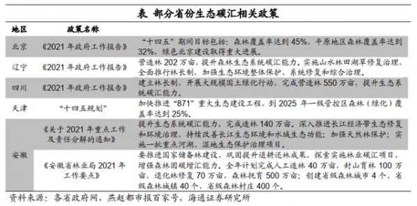 另外,地方政府关于清洁能源、碳汇的措施还在布局中,北京、辽宁等各地政府在2021年政府工作报告中重点提出要“提高碳汇能力”。