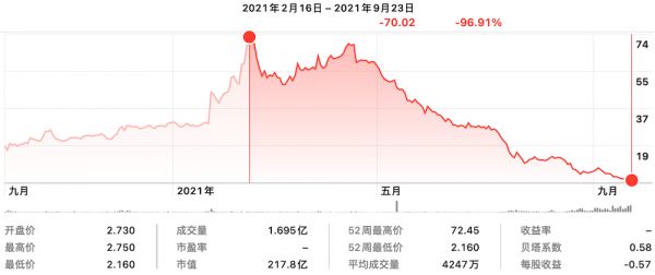 今年2月,恒大汽车股价达到历史高点72.45港元(约合60.17元人民币),市值突破6400亿港元(约合5315.2亿元人民币)。仅仅几个月的时间,其股价已经跌至2.23港元(约合1.85元人民币),市值仅剩217亿港元(约合180.22亿元人民币),跌幅近97%。