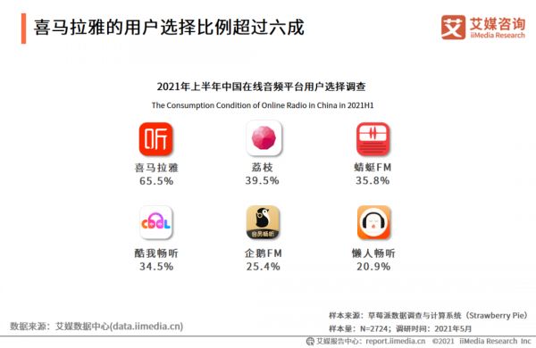 这其中,喜马拉雅便是以65.5%的高市场占有率成为最多用户选择的在线音频平台。荔枝、蜻蜓FM和酷我畅听等以30%多紧随其后。