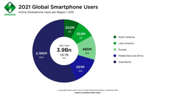 报告称在2021年,全球智能手机用户人数将达到39亿,同比增长6.1%。这项数据到2024年底预计将增长至45亿,年均复合增长率约6.1%。