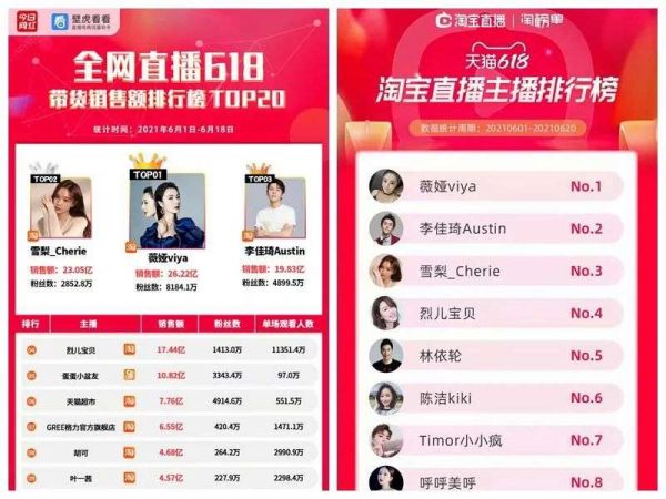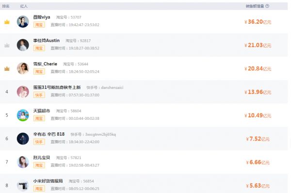 在今年的618狂欢中,有数据显示,雪梨在618期间(6月1日-6月18日)GMV超过李佳琦成为亚军。但淘宝官方公布的淘榜单显示,6月1日-6月20日期间,雪梨仍然屈居季军。