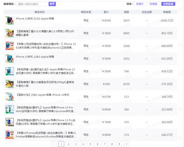 以雪梨9月17日的直播为例,数据显示,本场直播销售额最高的十款产品有8款为苹果13系列产品,另外两款分别为1800元的蟹太太大闸蟹礼券和600元的蟹太太鲍鱼金汤花胶鸡1500g礼盒装滋补港式火锅。