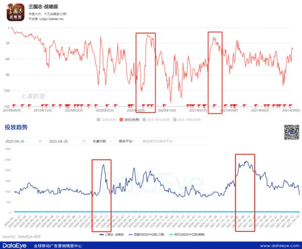 《三国志·战略版》在2020年8月和2021年2月买量加大投放,iOS免费榜排名的明显上涨,买量带来的效果还是比较显著的。