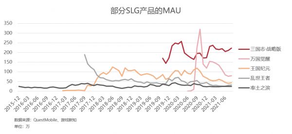200万MAU对不少竞品来说难以企及,更别提要持续维持这种水平了。比如《乱世王者》《万国觉醒》的MAU都在顶峰后快速下滑,2021年已经跌至100万以下;《王国纪元》在国内市场和《率土之滨》分别稳定在150万和50万以下。这样看来,《三国志·战略版》的下限已经是不少竞品的上限了。