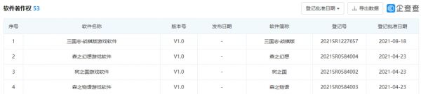 其中可能有两款可能逐渐露出水面。今年登记批准的软件著作权中,包括了《三国志·战棋版》这种可能尝试战棋的新品类,也有《森之幻想/树之国/森之物语》未知具体类型的新品。