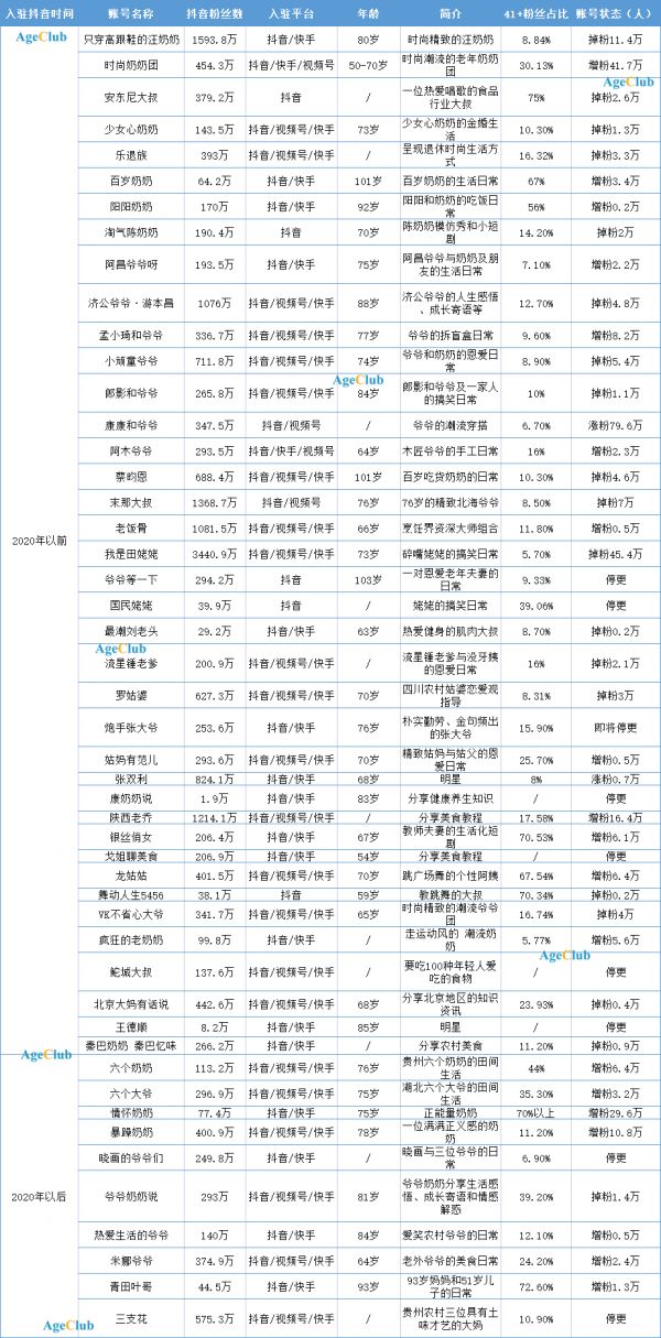 变化的不仅仅是汪奶奶,AgeClub综合研究了抖音50个头部、中部、腰部银发网红,我们发现,经历数年的发展,整个银发网红生态正迎来转折的节点。