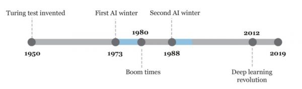 如果说 AI 并不是这些失败案例的罪魁祸首,那么为什么会被放到舆论的风口下被口诛笔伐呢?这主要是因为各种的炒作,导致人们对这个领域的期望过高。为了说明这一点,我们来看看 AI 的发展经过。
