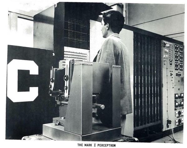 图:Mark 1 感知机,第一个感知机算法的应用。这个机器与一个使用20x20硫化镉电池的相机相连,能够生成一张400像素的图片。主要的可视特征就是一块插板,允许不同的输入组合进行试验。右边是电位计,实现权重的更新。