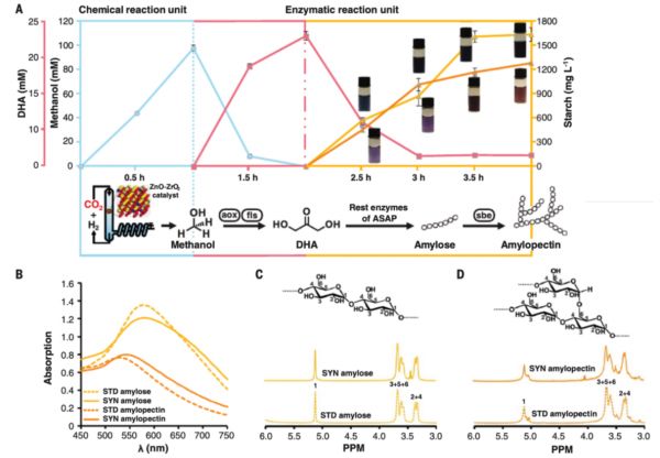 人工淀粉代谢合成途径(ASAP)由11种核心反应组成,在一个具有时空隔离的化学酶系统中,在氢气的驱动下,ASAP以每毫克催化剂每分钟消耗22nmol的二氧化碳来合成淀粉。