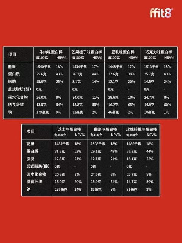 一根ffit8的蛋白棒大约有125Kcal,蛋白质的含量在45%左右,脂肪含量大约是20%,碳水化合物占比不到10%。相比之下,士力架提供的能量虽然更高,但是蛋白质的含量仅为14%,脂肪含量超过40%,碳水化合物的含量为19%。